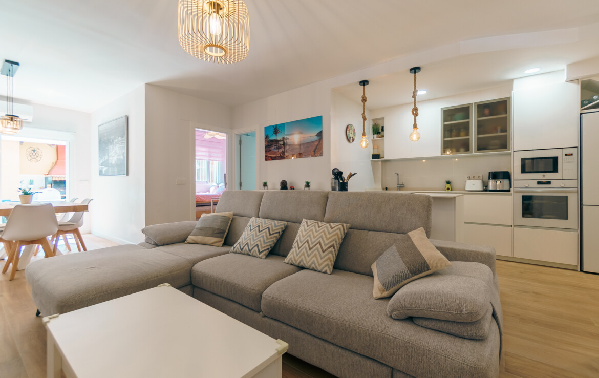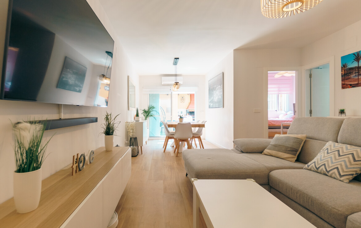 This beautiful apartment offers two bedrooms, including a master suite with an en-suite bathroom, as well as a second full bathroom. The spacious living and dining area features an open-plan, fully equipped kitchen and is fitted with air conditioning for both heating and cooling.