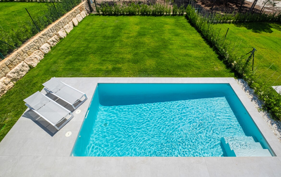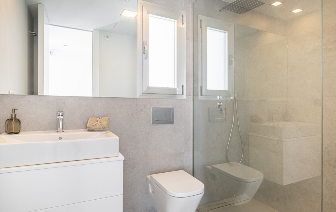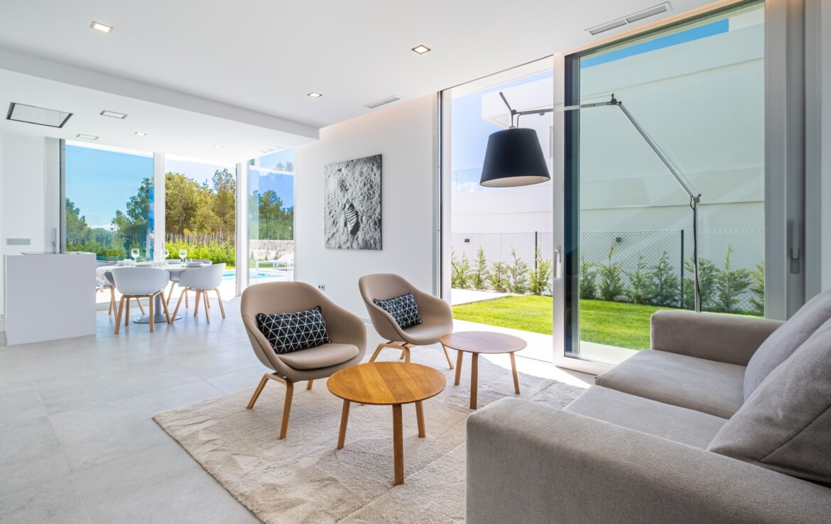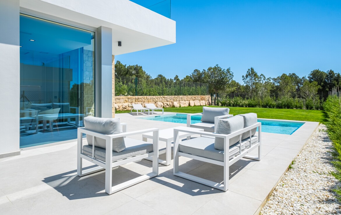 Modern style villa with 3 bedrooms and 3 bathrooms, two of them en suite, spacious living-dining room with open American-style kitchen with island, and a large open terrace with sea-views. It has a private swimming pool and a covered carport.