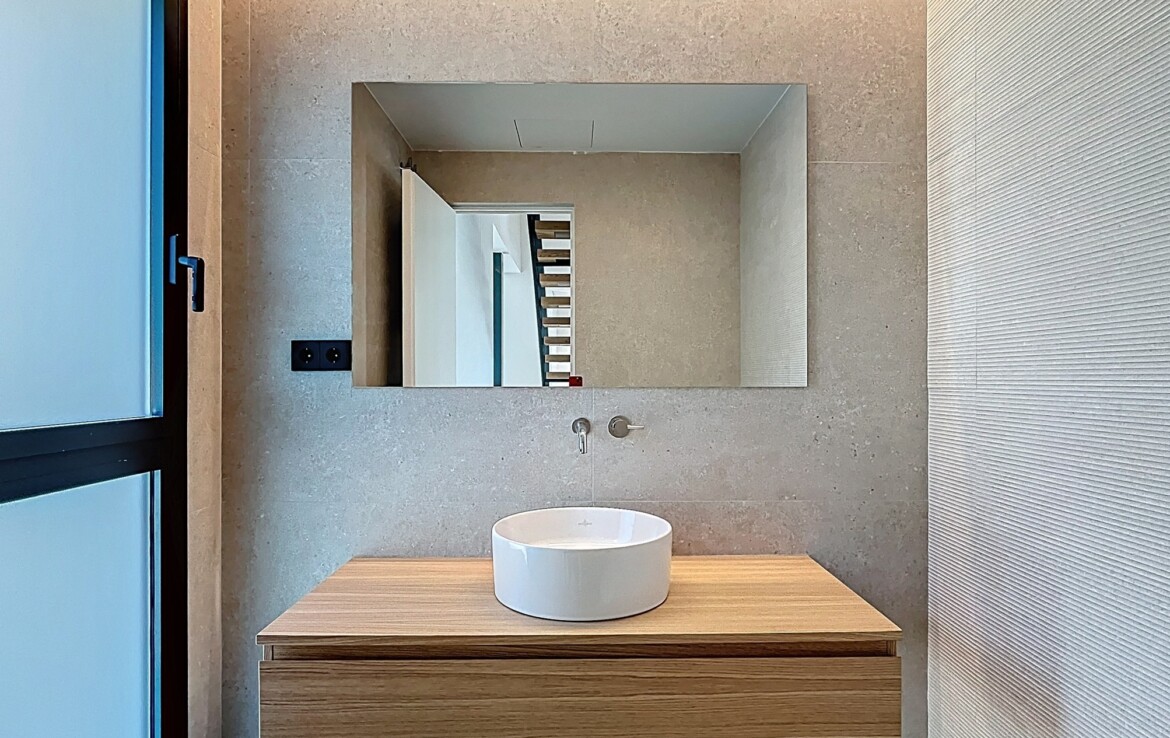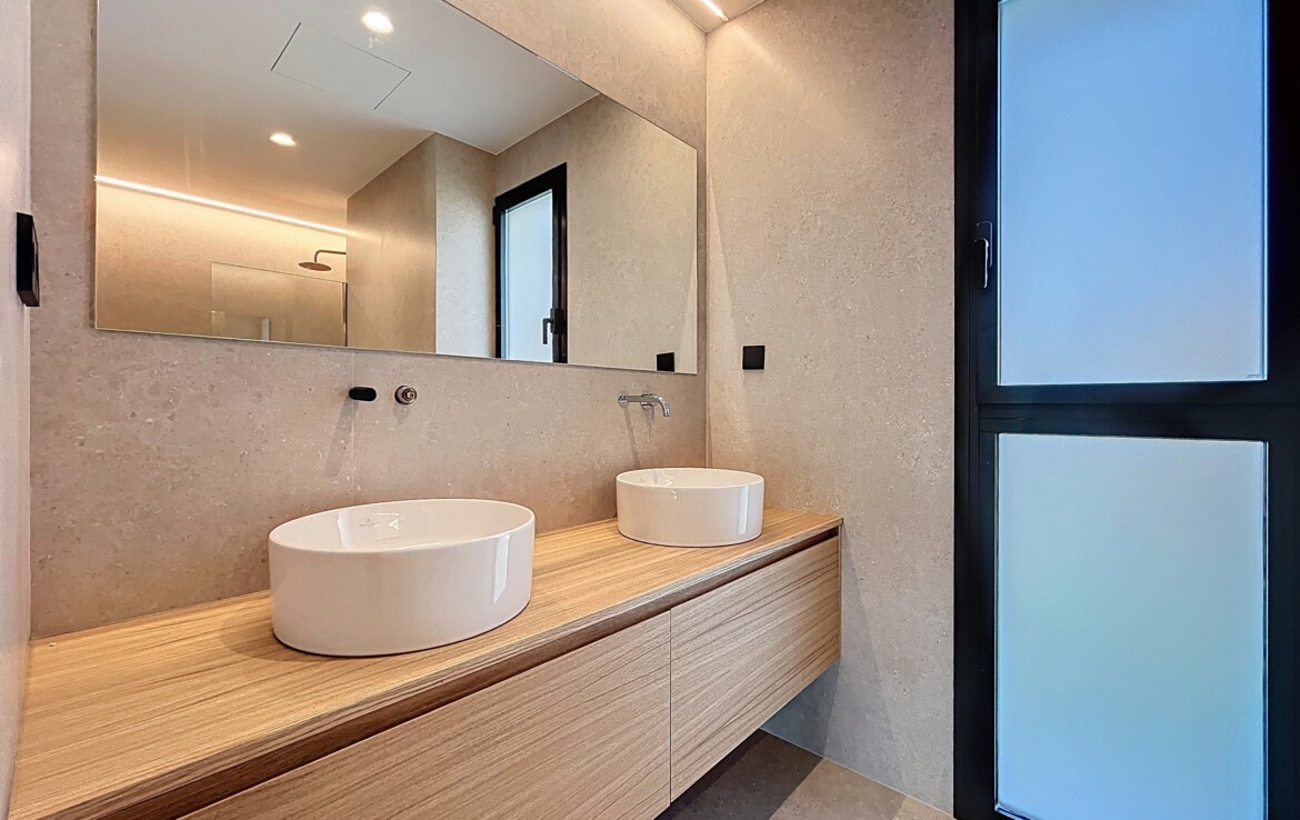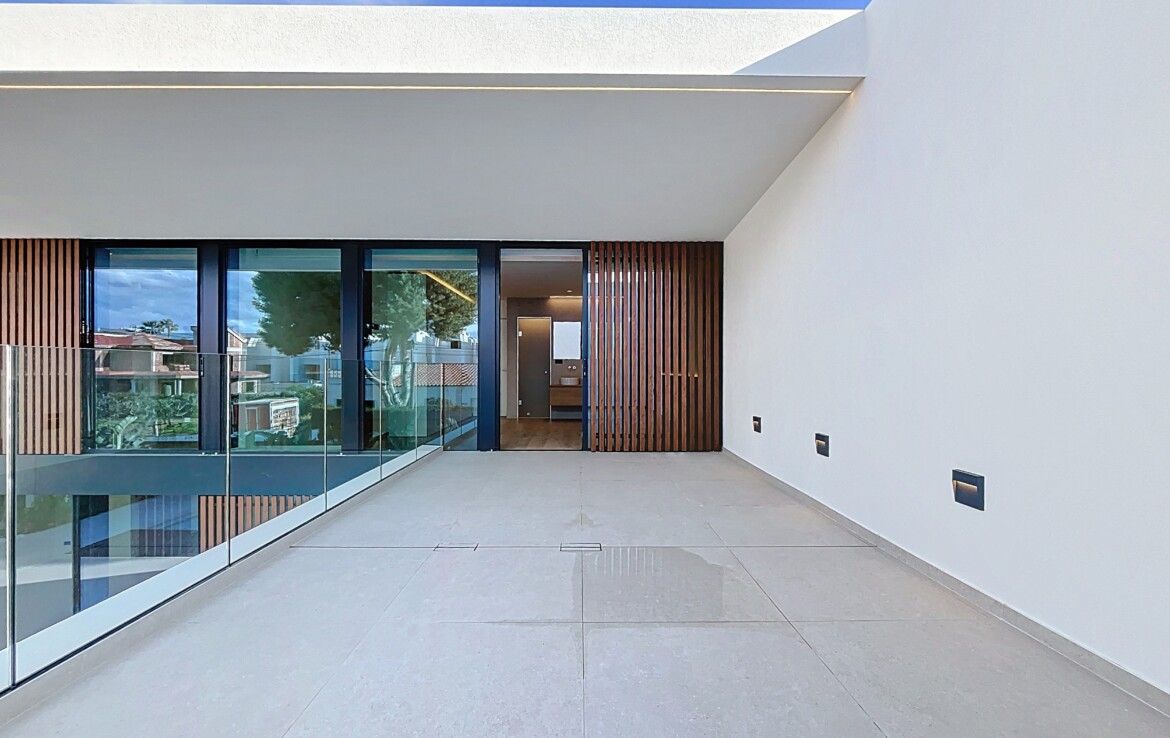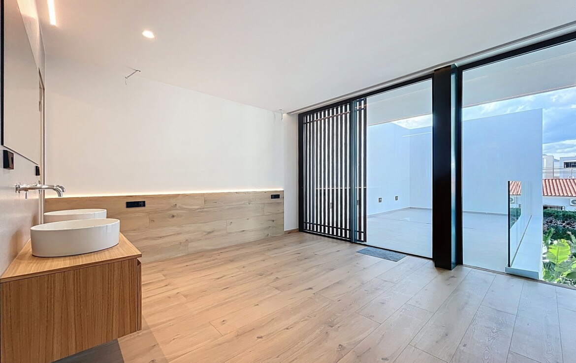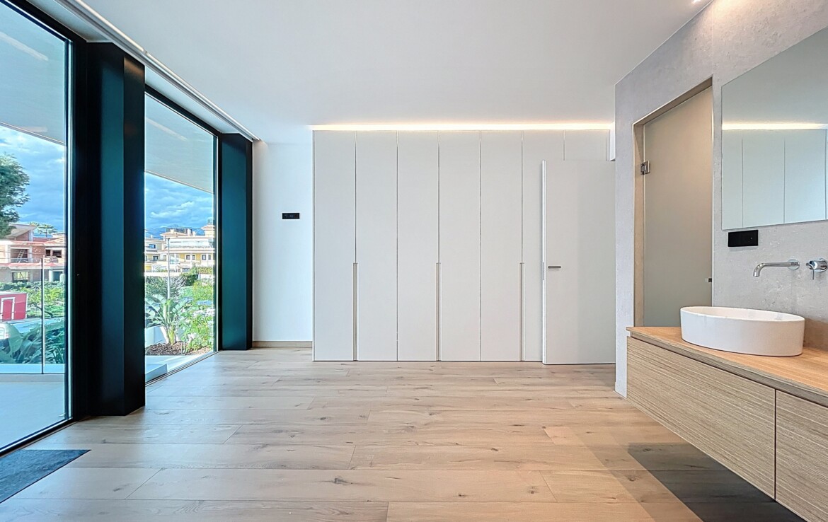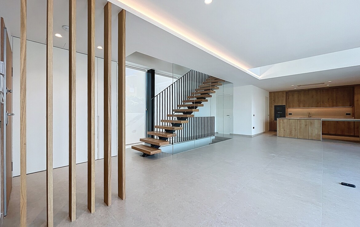Also on the ground floor, you’ll find a covered garage, a guest toilet, and a laundry room – all with direct access to the outdoors. A sleek central staircase with a cantilevered wooden tread design leads to the first floor, where a double-height landing connects to three generous bedrooms. Two of the bedrooms are 24 m², and the third is 15 m². Each features an en-suite bathroom, natural cross-ventilation, custom-built lacquered wardrobes integrated into the walls, and direct access to the main terrace.