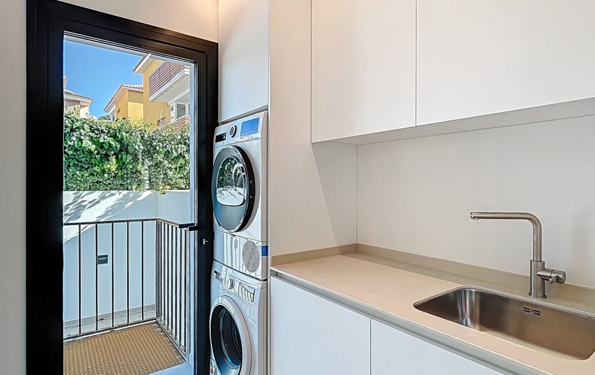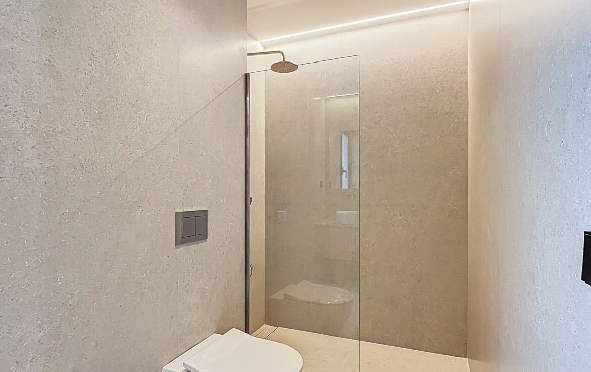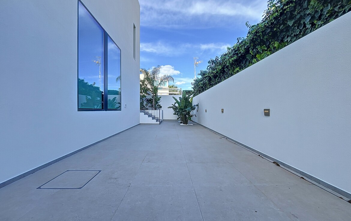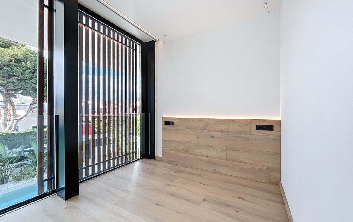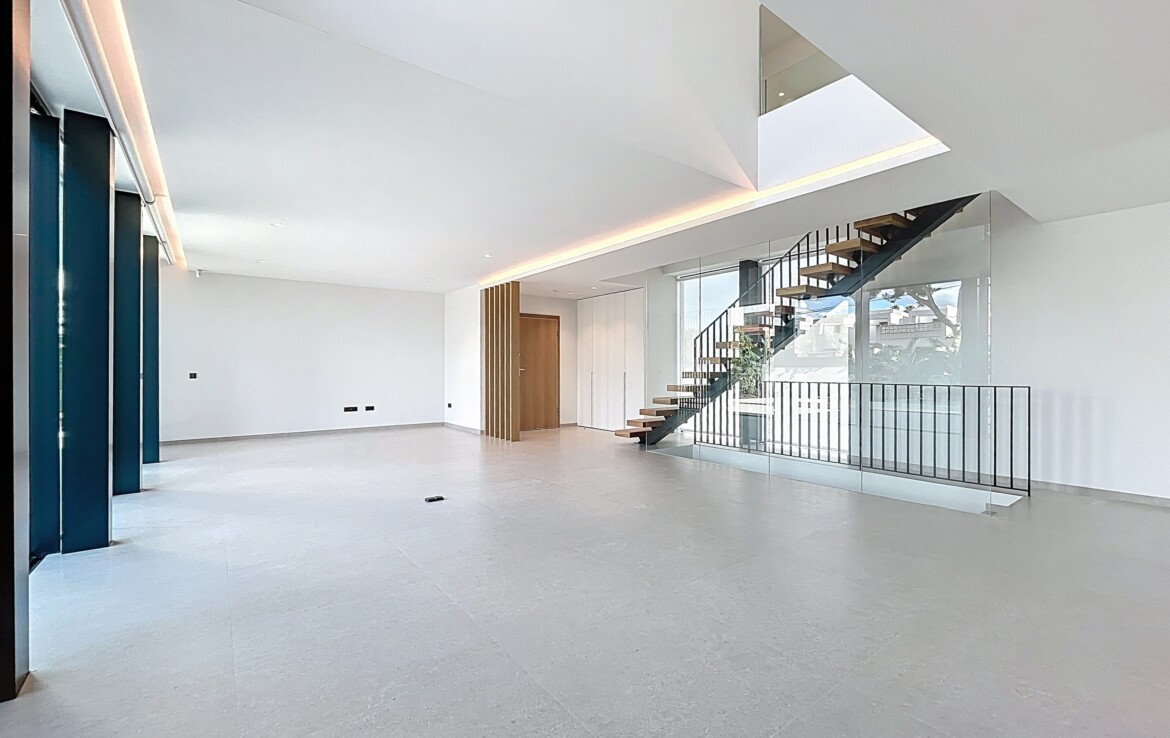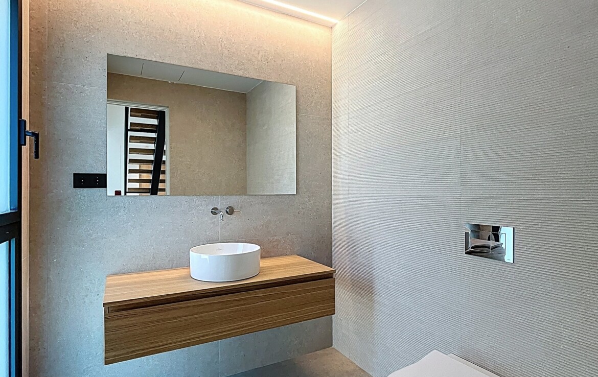 Also on the ground floor, you’ll find a covered garage, a guest toilet, and a laundry room – all with direct access to the outdoors. A sleek central staircase with a cantilevered wooden tread design leads to the first floor, where a double-height landing connects to three generous bedrooms. Two of the bedrooms are 24 m², and the third is 15 m². Each features an en-suite bathroom, natural cross-ventilation, custom-built lacquered wardrobes integrated into the walls, and direct access to the main terrace.