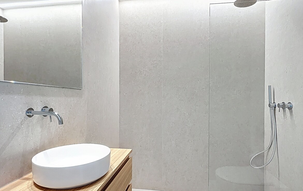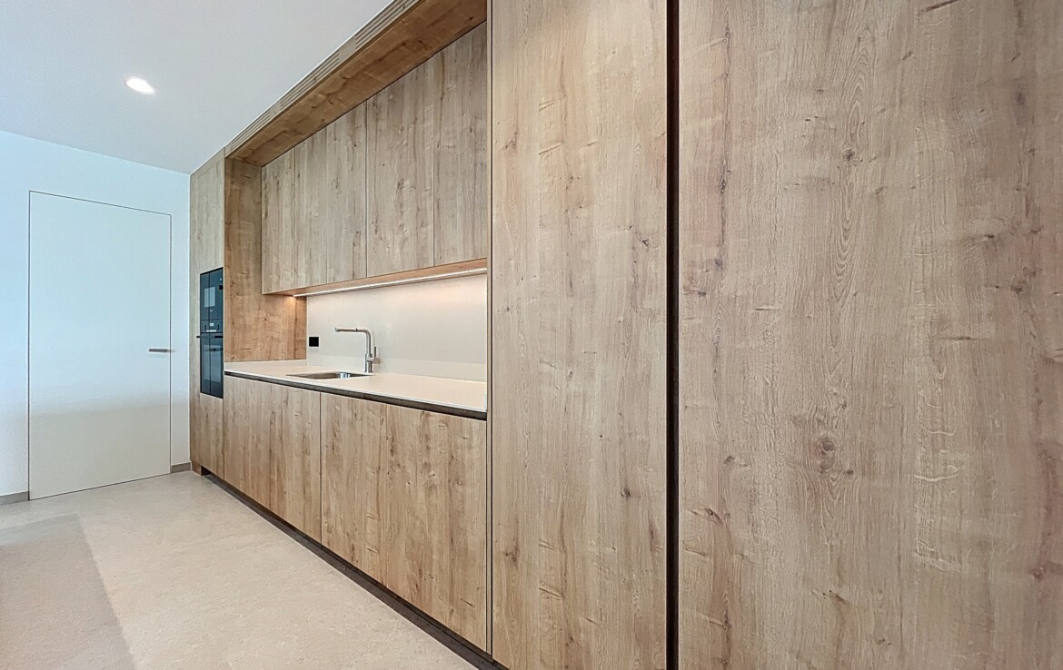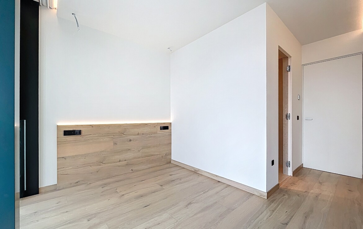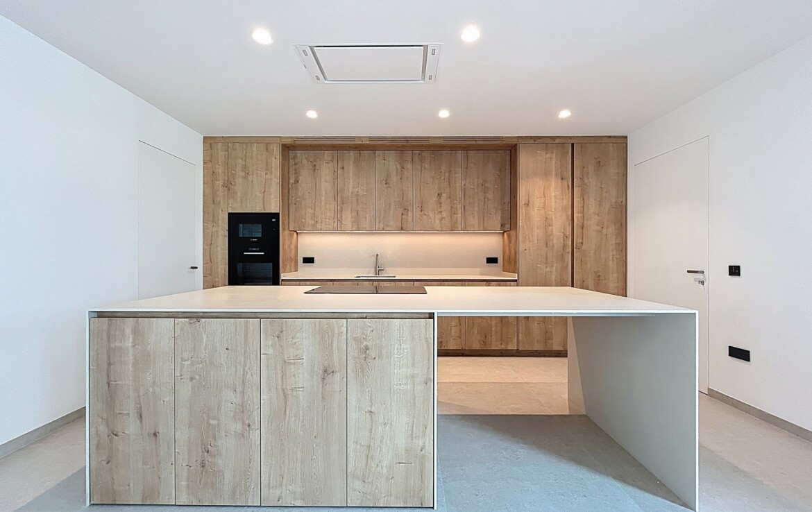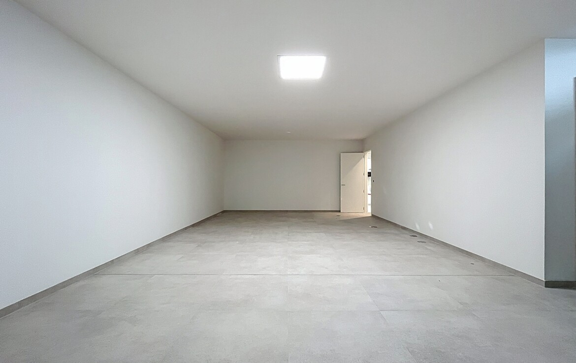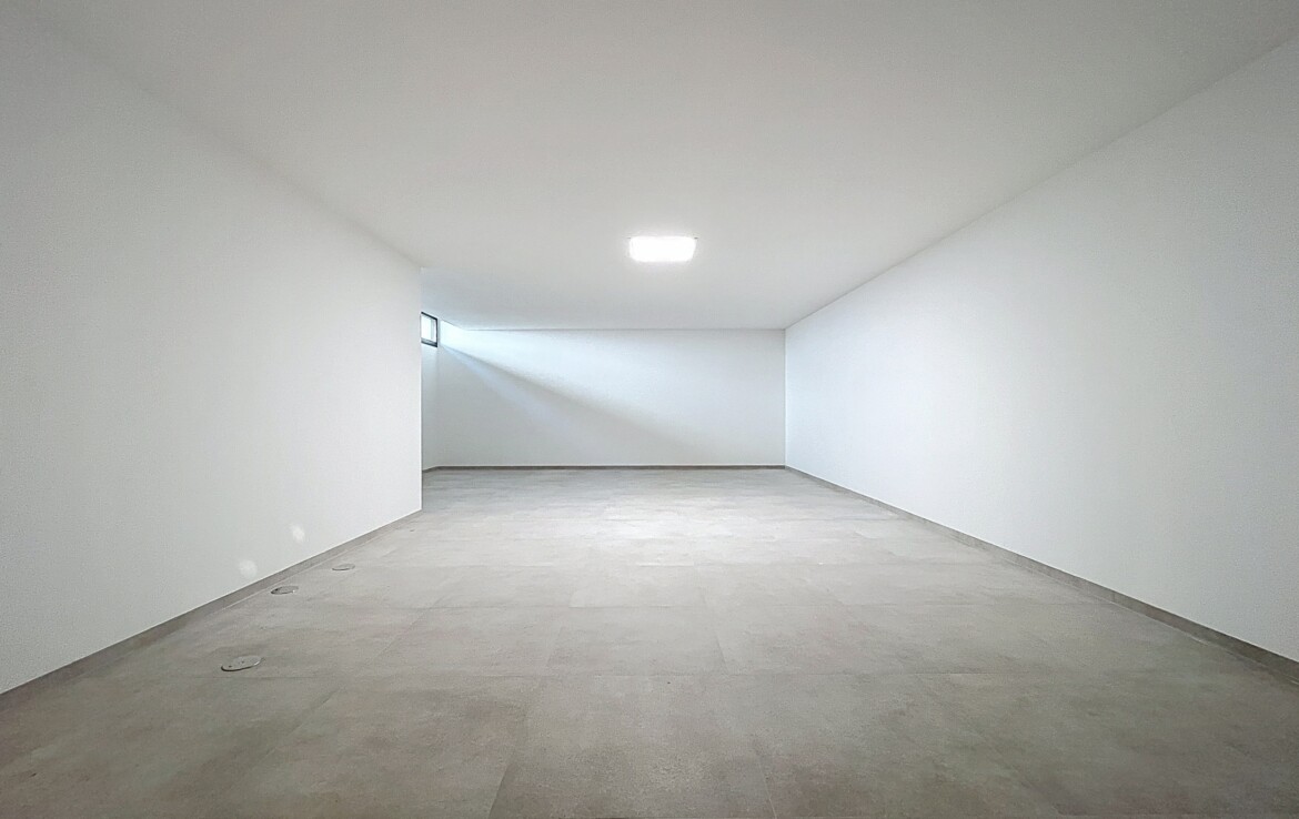 Also on the ground floor, you’ll find a covered garage, a guest toilet, and a laundry room – all with direct access to the outdoors. A sleek central staircase with a cantilevered wooden tread design leads to the first floor, where a double-height landing connects to three generous bedrooms. Two of the bedrooms are 24 m², and the third is 15 m². Each features an en-suite bathroom, natural cross-ventilation, custom-built lacquered wardrobes integrated into the walls, and direct access to the main terrace.
